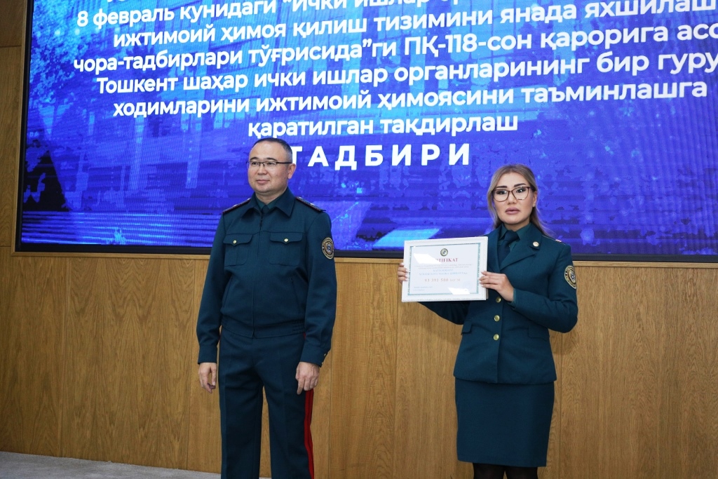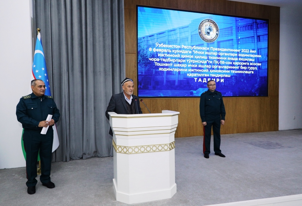 Среди личного состава ГУВД города Ташкента состоялось духовно-просветительское мероприятие, посвящённое теме: «Добрососедские отношения, дружба-гарантия мира». Доклад был подготовлен старшим преподавателем Международной исламской академии Узбекистана Азамжоном Мирзакамбаровым. В своём выступлении он подчеркнул, что мир и согласие между народами является величайшим достижением нашей страны. Также, в ходе мероприятия на основании Постановления Президента и Кабинета Министров Республики Узбекистан “О регулировании системы социальной защиты личного состава Органов внутренних дел и Национальной Гвардии Республики Узбекистан и членов их семей”, состоялась церемония вручения нескольким сотрудникам столичного ГУВД сертификатов, в целях обеспечения социальной защиты и получения первоначального взноса в размере 25 процентов стоимости жилья, приобретаемого на основании ипотечного кредита. Данные сертификаты в торжественной обстановке вручал заместитель министра внутренних дел Республики Узбекистан, генерал-майор Азиз Икрамов, пожелавший сотрудникам успехов в дальнейшей служебной деятельности.