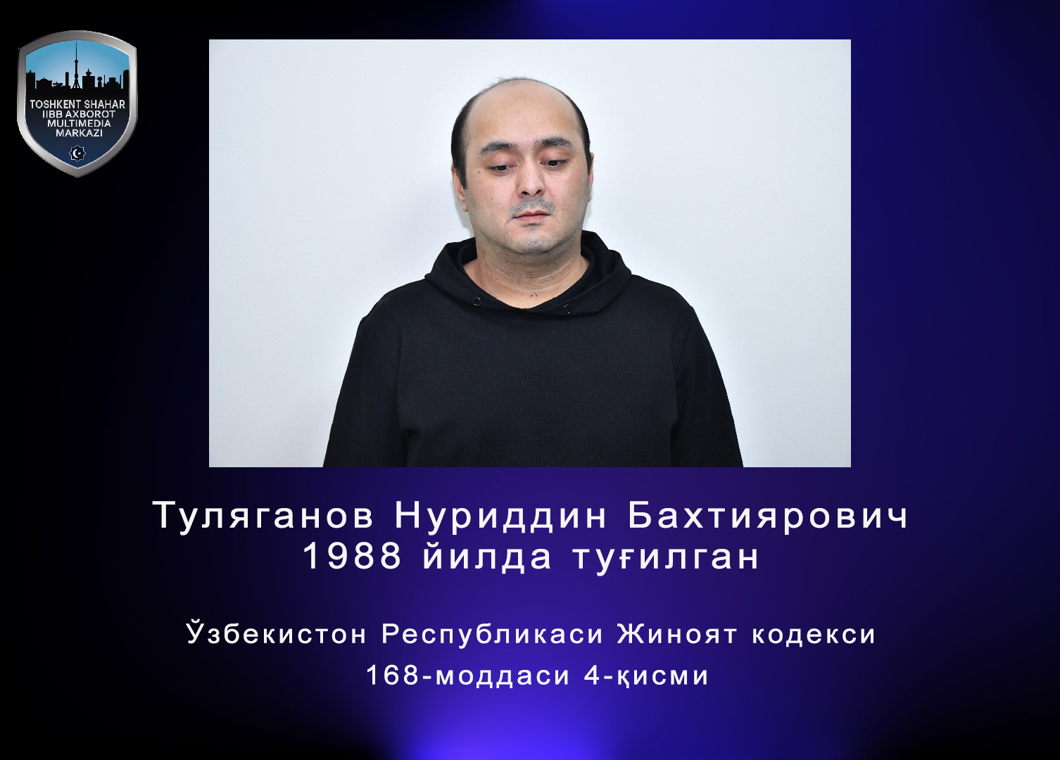 4. 1988 y.t. Tulyaganov Nuriddin Baxtiyarovich (O‘zbekiston Respublikasi Jinoyat kodeksi 168-moddasi 4-qismi);