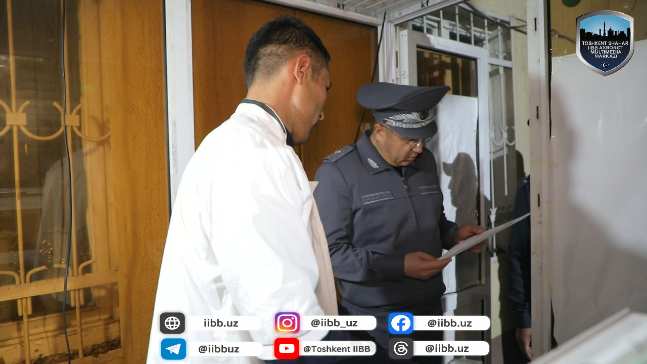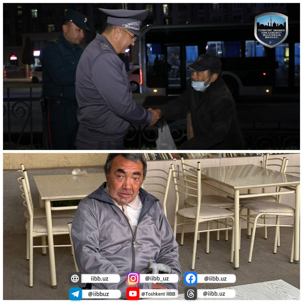 Mahallalarni ko‘zdan kechirish jarayonida yo‘l chetida turgan keksa yoshdagi fuqaro bosh boshqarma boshlig‘ining eʼtiborini tortdi. Olib borilgan suhbatdan so‘ng ushbu shaxsning ijtimoiy qiyin ahvolga tushib qolganligi va boshpanasiz ekanligi aniqlandi. Unga tibbiy yordam ko‘rsatilib, Toshkent shahar IIBB qoshidagi “Mehr saxovat” uyiga joylashtirildi. Tungi xizmat faoliyati o‘rganishlar davom etmoqda.
