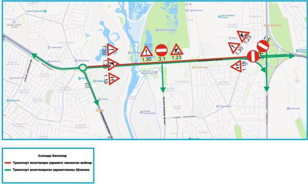 Yuzaga kelgan noqulayliklar uchun uzr so‘raymiz va haydovchilarga muqobil yo‘nalishlardan foydalanib, Xusayn Boyqaro, Parkent yo’li, Xonobodtepa, Shoximardon ko'chalaridan harakatlanishlari tavsiya etiladi.