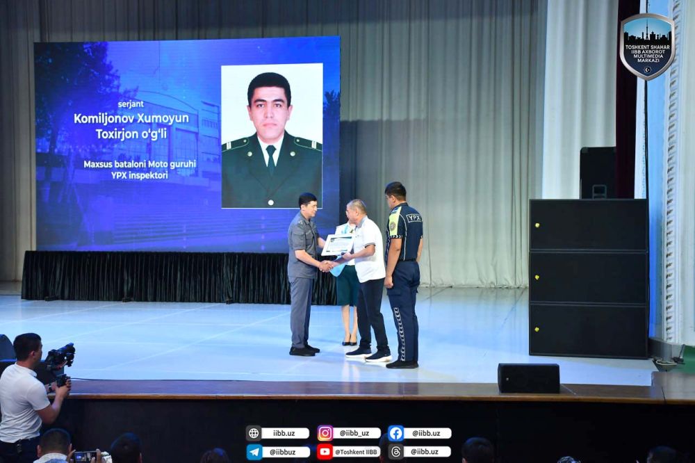 Шундан сўнг ўз хизмат бурчларини виждонан бажариб келаётган, пойтахтимиз ҳудудида жамоат тартибини сақлаш, фуқароларимиз хавфсизлигини, ҳуқуқ ва эркинликларини таъминлаш, жиноятчиликка қарши курашиш борасида самарали хизмат қилаётган бир гуруҳ ходимларимизни тақдирлаш учун сўз ИИББ бошлиғи ўринбосари, полковник Алиаҳмед Чориевга берилди. А.Чориев пойтахт Ички ишлар бош бошқармаси томонидан ҳудудда тинчлик-осойишталикни таъминлаш борасида соҳавий хизматлар томонидан амалга оширилаётган ишларга эътиборни қаратди. Тошкент шаҳар аҳолисига қулайликлар яратиш, кўчаларда ҳаракат хавфсизлигини таъминлаш, йўл-транспорт ҳодисалари, жиноятчиликни олдини олиш, жамоат тартибини сақлаш, хавфсизлигини таъминлаш, гиёҳвандлик ва психотроп моддаларни аниқлаш, гиёҳвандлик билан боғлиқ жиноятларни фош этиш, қидирувдаги шахсларни ушлаш, оммавий тадбирларда барқарорликни таъминлаш ишларида фаол қатнашиб, ўз вазифаларига виждонан, сидқидилдан ёндашиб, ҳамкасбларига ўрнак бўлиб келаётган бир гуруҳ ходимларга мукофотлар топширилди. Уларнинг ота-оналарига миннатдорлик эълон қилинди. Ички ишлар органларида самарали меҳнат қилиб, хизмат муддатларини ўтаб, нафақа ёшига етган ходимлар тантанали равишда нафақага кузатилди. Йиғилишнинг бадиий қисми ИИББ қошидаги “Ниҳол” ҳаваскорлик гуруҳининг бадиий чиқишлари, шўх куй-қўшиқлари, рақслари билан давом эттирилди.