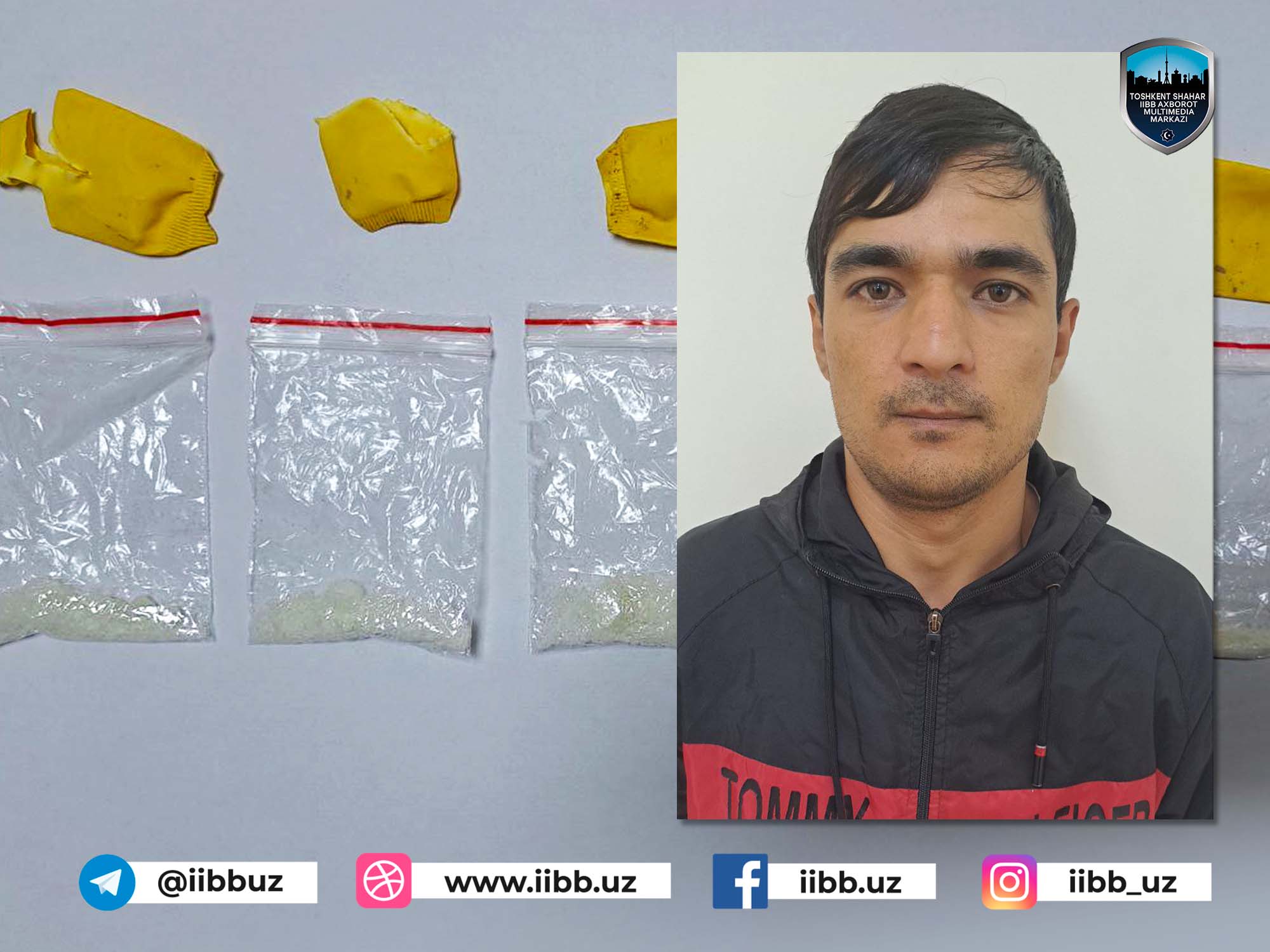 По сообщению, поступившему из УКД ОВД Сергелийского района, в ходе проведения профилактических мероприятий, направленных на пресечение фактов хранения и сбыта наркотических средств и психотропных веществ, был задержан 26-летний Тулкинжон К. При личном досмотре, в присутствии понятых, в качестве вещественного доказательства у него было изъято наркотическое средство синтетического происхождения, расфасованное по полиэтиленовым пакетам в количестве 13 штук общим весом 3,9 грамм. В ходе дальнейших оперативно-розыскных мероприятий было установлено, что мужчина успел произвести пять закладок в тайниках. Сотрудниками оперативно-розыскной службы УКД ОВД Сергелийского района были определены места закладок, откуда в качестве вещественного доказательства было изъято 1,5 грамма наркотического средства синтетического происхождения.