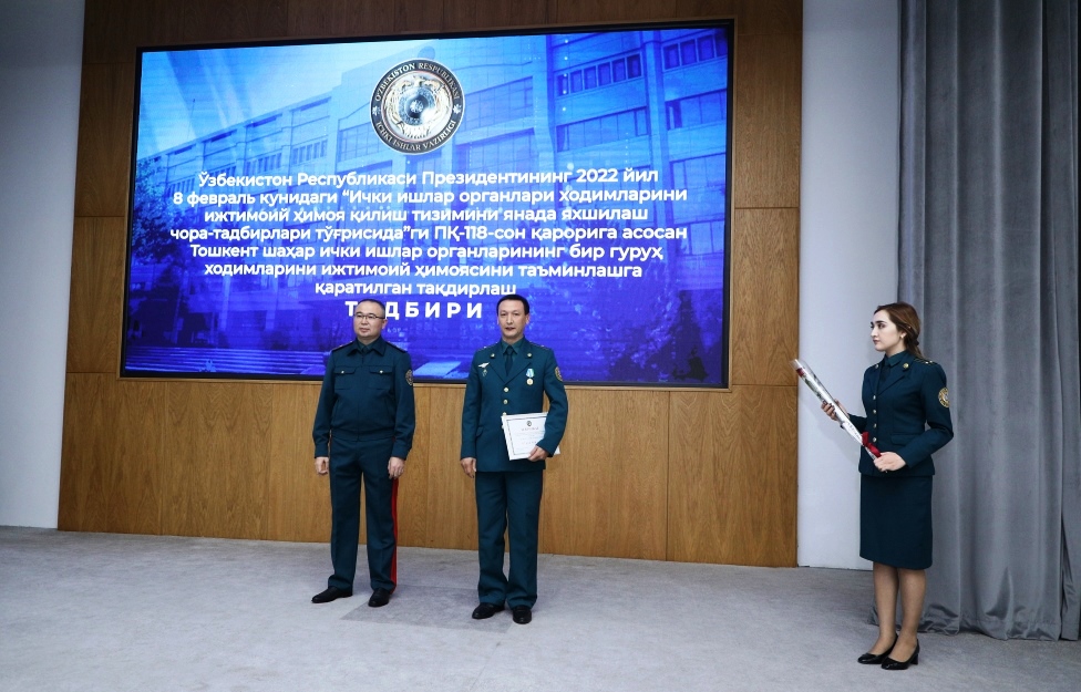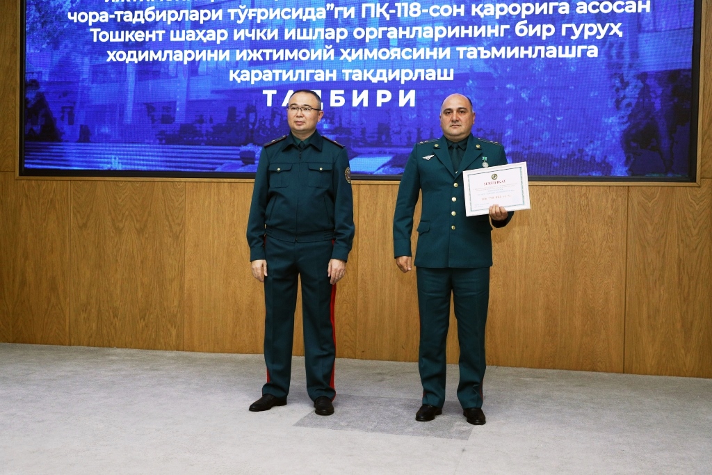 Среди личного состава ГУВД города Ташкента состоялось духовно-просветительское мероприятие, посвящённое теме: «Добрососедские отношения, дружба-гарантия мира». Доклад был подготовлен старшим преподавателем Международной исламской академии Узбекистана Азамжоном Мирзакамбаровым. В своём выступлении он подчеркнул, что мир и согласие между народами является величайшим достижением нашей страны. Также, в ходе мероприятия на основании Постановления Президента и Кабинета Министров Республики Узбекистан “О регулировании системы социальной защиты личного состава Органов внутренних дел и Национальной Гвардии Республики Узбекистан и членов их семей”, состоялась церемония вручения нескольким сотрудникам столичного ГУВД сертификатов, в целях обеспечения социальной защиты и получения первоначального взноса в размере 25 процентов стоимости жилья, приобретаемого на основании ипотечного кредита. Данные сертификаты в торжественной обстановке вручал заместитель министра внутренних дел Республики Узбекистан, генерал-майор Азиз Икрамов, пожелавший сотрудникам успехов в дальнейшей служебной деятельности.