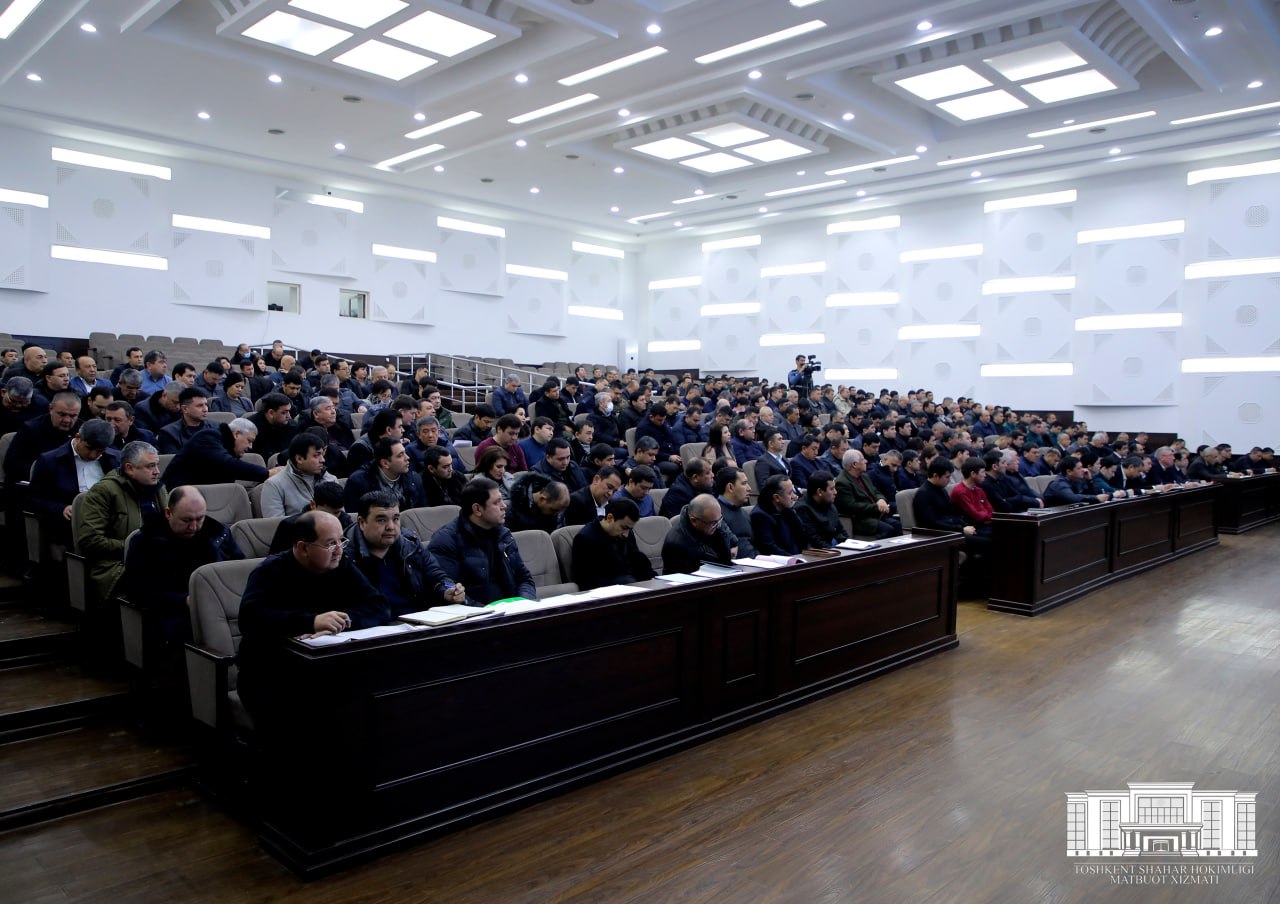 27 января в актовом зале Ташкентского государственного экономического университета состоялось собрание, в котором участвовали заместитель советника Президента Улугбек Мухаммадиев, ответственный сотрудник Администрации Президента Фарход Азизов, исполняющий обязанности хокима Ташкента Бахтиёр Рахманов и заместители, хокимы районов и их заместители, начальники секторов города и районов и другие должностные лица.