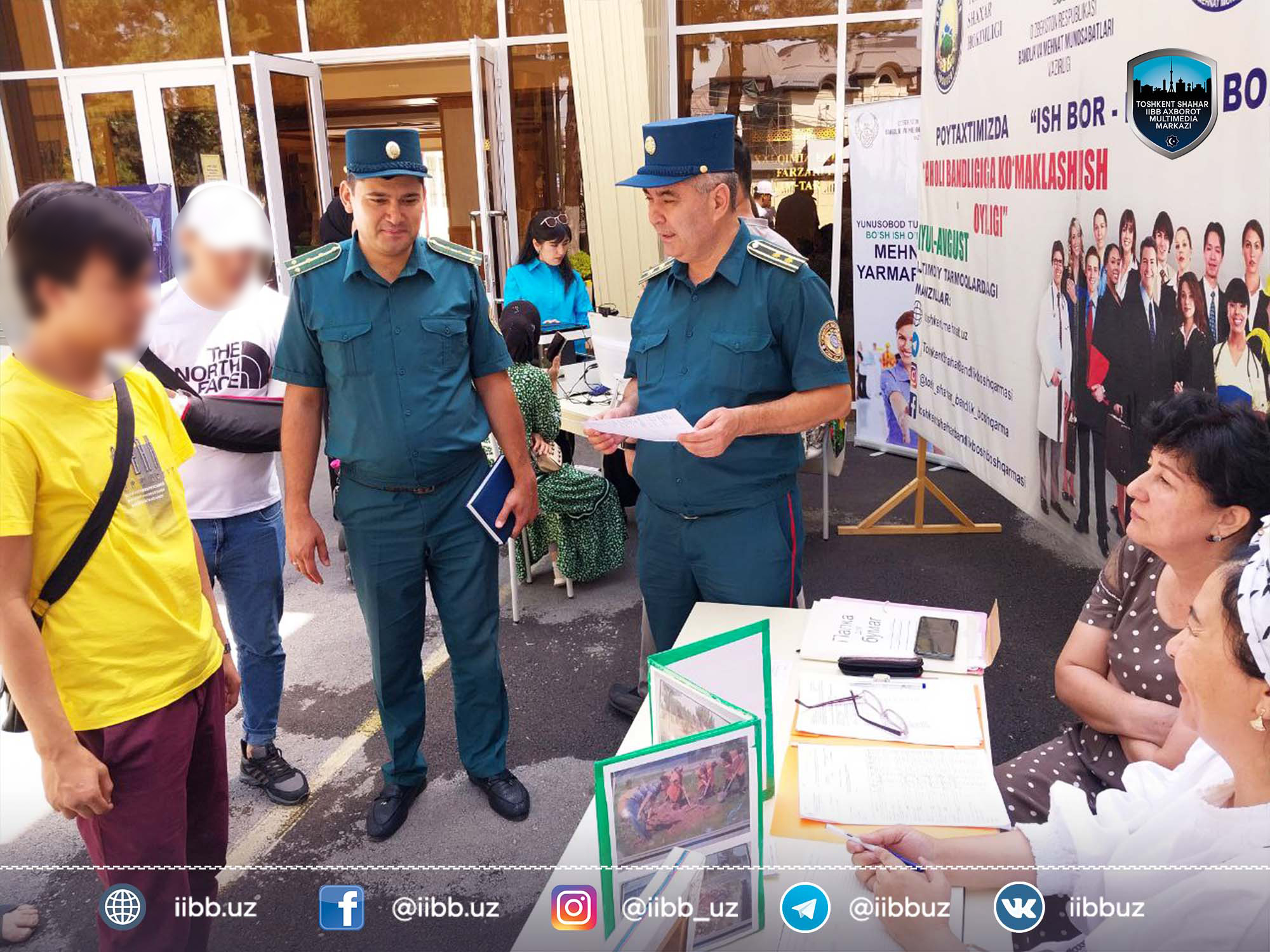 В числе задач службы пробации – содействие гражданам, состоящим на учёте, в решении вопросов трудоустройства. Одна из форм работы в данном направлении – проведение трудовых ярмарок. По инициативе отдела пробации УКД ОВД Юнусабадского района совместно с районным Центром содействия занятости населения под девизом “Приглашаем на работу” на территории средней школы №220 была организована трудовая ярмарка для лиц, освободившихся из мест лишения свободы и находящихся на учёте. В мероприятии более десяти организаций и предприятий различных форм собственности, функционирующих на территории района представили информацию об имеющихся вакантных местах. Посетили ярмарку более 30 человек, из них 12 получили направление на работу.