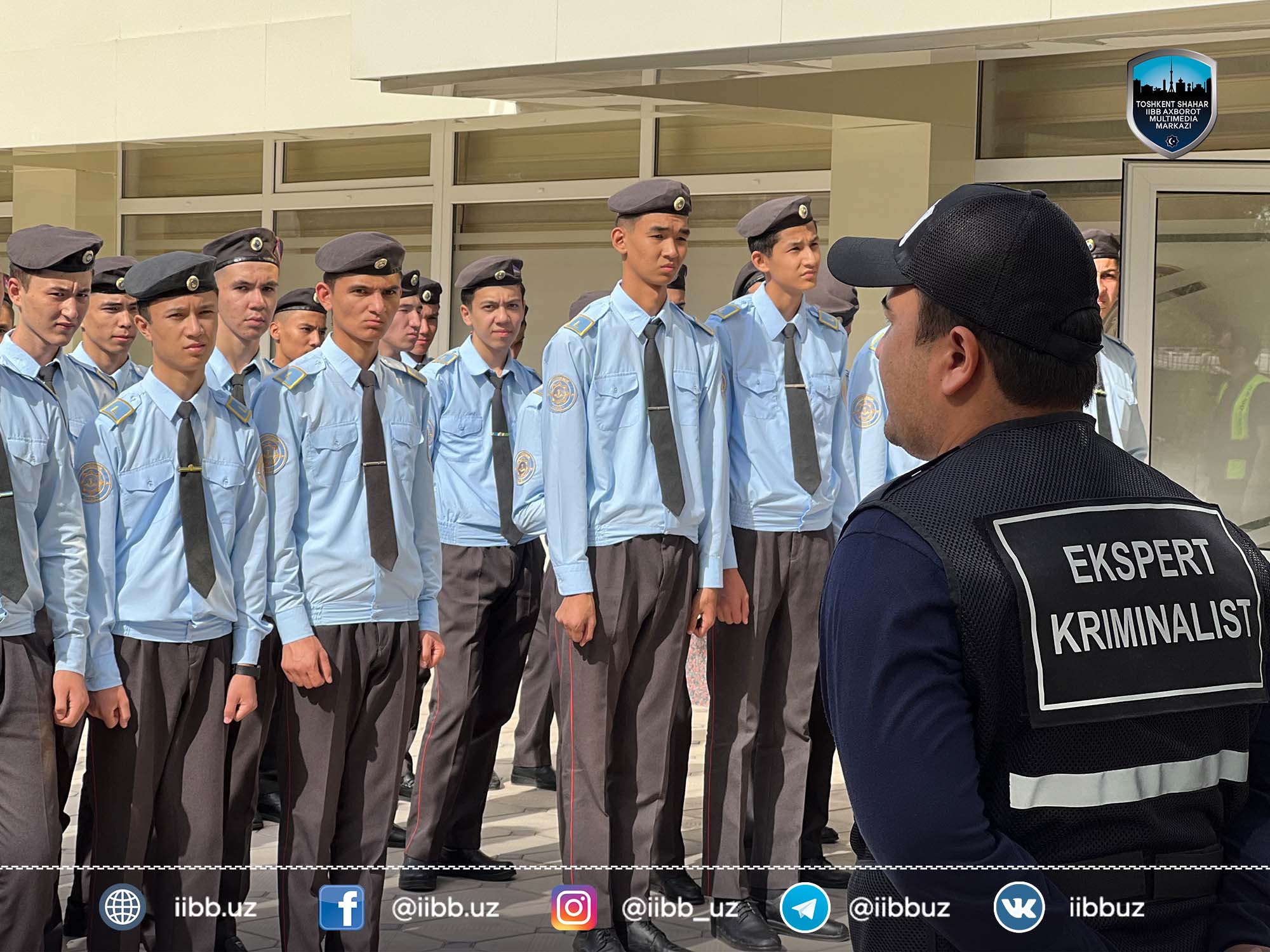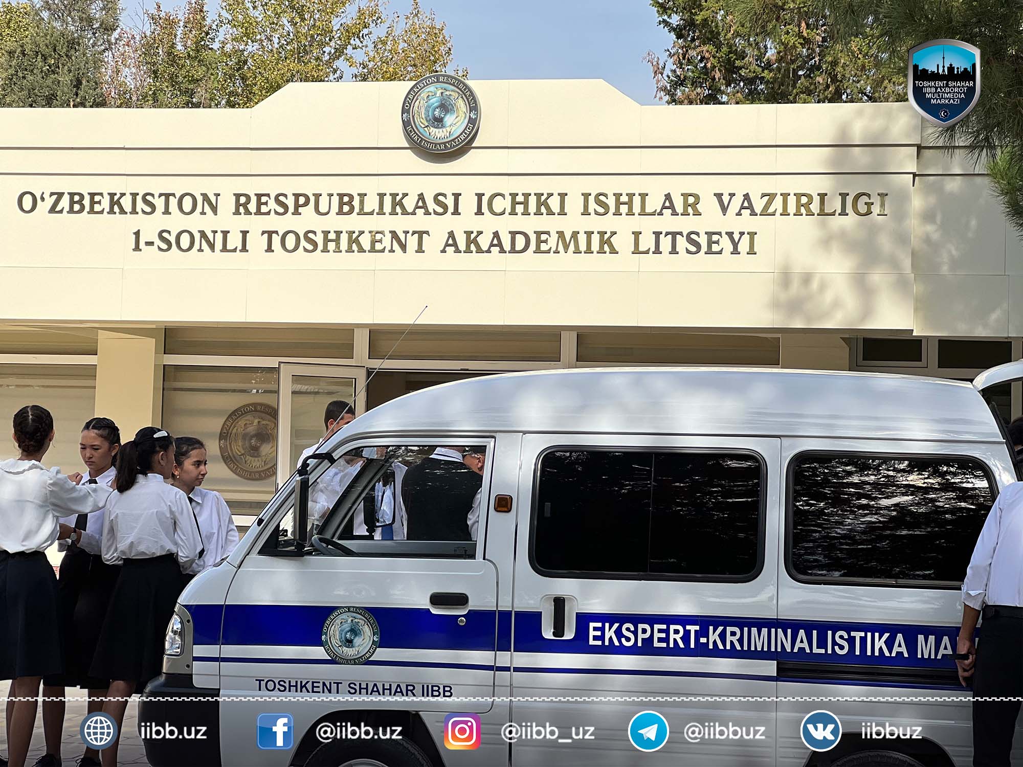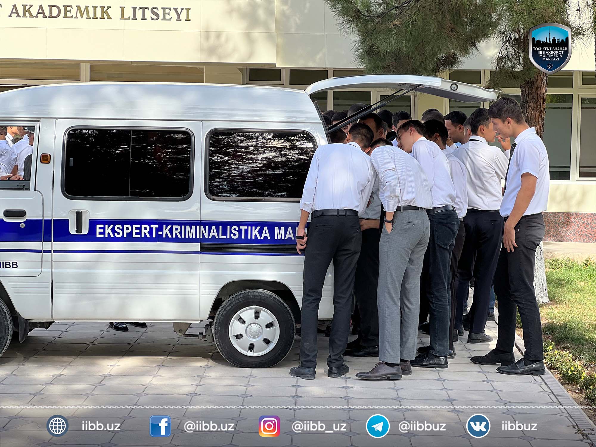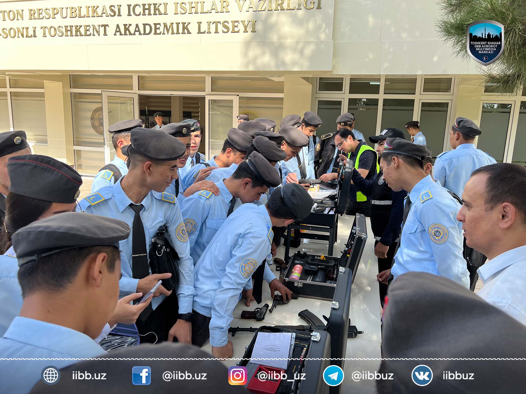 В рамках месячника профессиональной подготовки для учащихся Ташкентского академического лицея №1 МВД Республики Узбекистан организовываются встречи, практические занятия с сотрудниками отраслевых подразделений ГУВД столицы. Так, недавно лицеисты встретились с сотрудниками ЭКЦ ГУВД Ташкента. Специалисты рассказали о деятельности центра и его территориальных подразделений, современных возможностях экспертно-криминалистического центра, провели занятие, посвящённое работе экспертов в составе следственно-оперативных групп. В рамках мероприятия вниманию ребят была представлена мобильная экспертно-криминалистическая лаборатория, оснащённая новейшим оборудованием, необходимым при осмотре мест происшествий. Профессионалы дали исчерпывающие ответы на все вопросы лицеистов.
