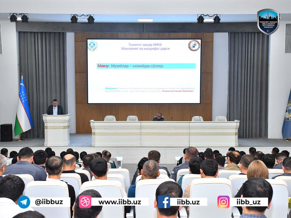 Среди личного состава ГУВД города Ташкента было проведено духовно-просветительское мероприятие, посвящённое теме «Музеи – сокровище нашей памяти». Доклад был подготовлен представителем Государственного музея истории Узбекистана доктором исторических наук Алишером Исмаиловым. В своём выступлении он отметил, что наличие множества музеев с самыми различными коллекциями отражает особенности общественного и культурного развития Узбекистана. Музеи играют не только просветительную роль, но и активно способствуют воспитанию молодого поколения в духе патриотизма, гордости за великих предков. Именно музеи помогают приобщиться к культурному, историческому, художественному наследию, к общечеловеческим ценностям, ознакомиться с памятниками истории, науки, традициями и бытом народов, произведениями искусств.