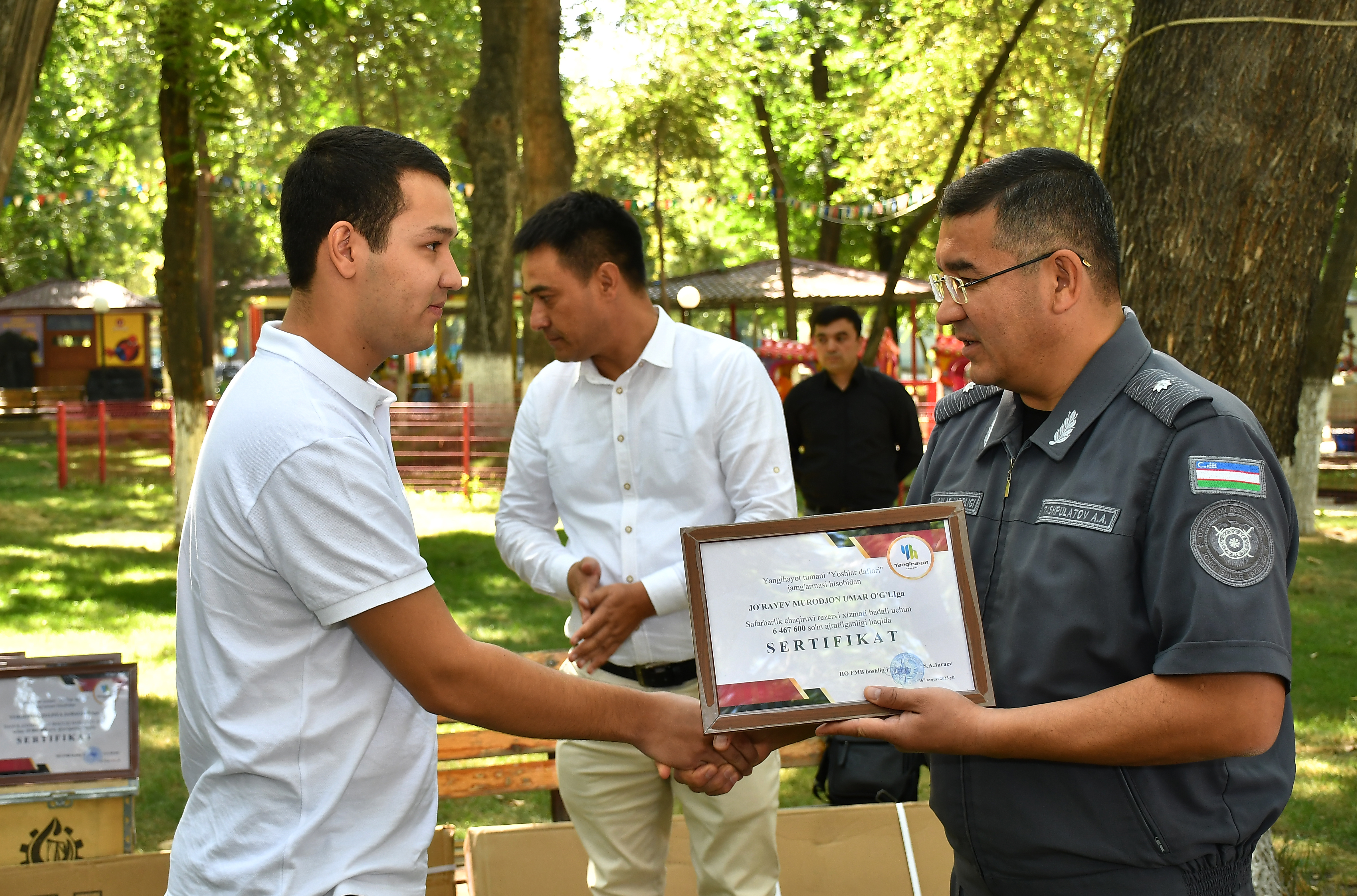 В ходе встречи 6 представителям молодежи были переданы ноутбуки, еще трем мотокультиваторы, швейные машинки, оверлок и кухонные принадлежности. Теперь молодые люди стали официально самозанятоми. Они поблагодарили руководство ГУВД г. Ташкента за оказанную помощь. Кроме того, 3 студентам передали сертификаты на оплату контракта для обучения, и еще двум парням вручили сертификаты для прохождения срочной военной службы.