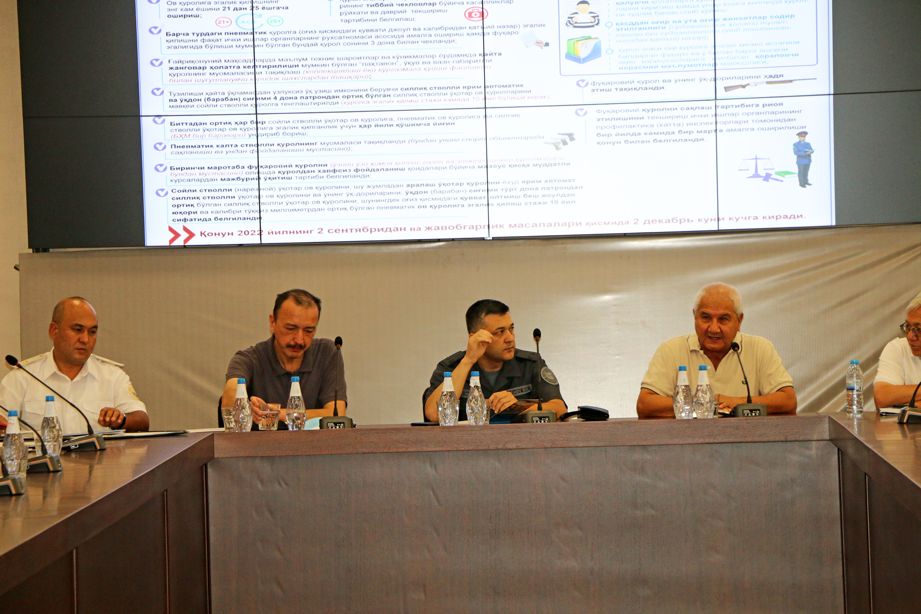 В ходе встречи присутствующим разъяснили суть и значение Закона №772 «О внесении изменений и дополнений в некоторые законодательные акты Республики Узбекистан в связи с совершенствованием законодательства об оружии» от 31 мая 2022 года.