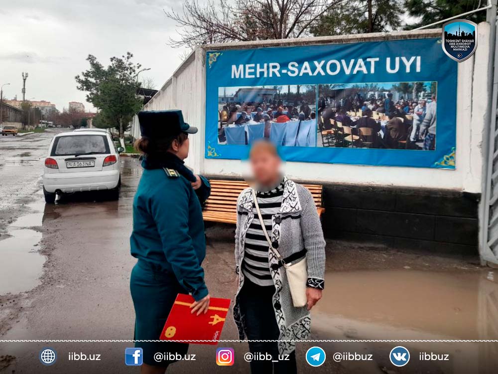Одной из задач работы инспекторов по вопросам женщин ГУВД города Ташкента является изучение условий проживания и возникающих проблем женщин и девушек, оказание своевременной помощи и поддержки, проведение бесед и консультаций. К примеру, старшему инспектору по вопросам женщин УКД ОВД Янгихаётского района подполковнику Р.Бинали сообщили о том, что жительница махалли «Тошкент» 66-летняя Т. М. оказалась в трудной жизненной ситуации: сама она прописана в вышеуказанной махалле, но после смерти мужа, родственники продали дом и женщина в преклонном возрасте осталась без постоянного местожительства. Данная информация не осталась без внимания подполковника Р.Бинали. Были собраны необходимые документы и женщину поместили в приют для бездомных «Мехр саховат», организованный ГУВД города Ташкента при Центре по реабилитации лиц без определенного места жительства.