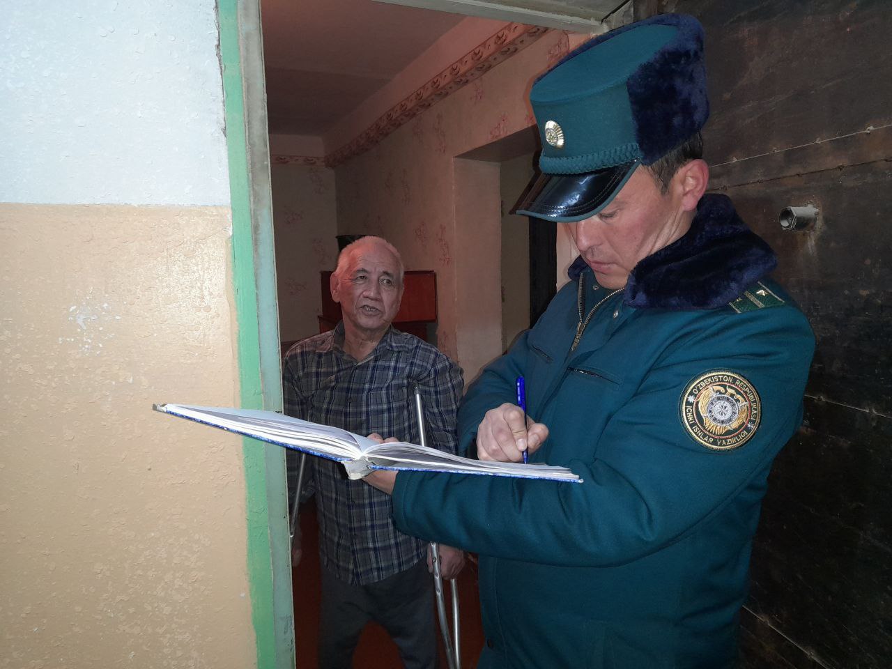 В связи с резким похолоданием, инспектора профилактики, инспектора-психологи и старшие инспектора по вопросам женщин ГУВД г. Ташкента в усиленном режиме несут службу на вверенной территории. Стражи правопорядка вместе с сотрудниками Медуправления МВД, представителями хокимията, жилищно-коммунального хозяйства проводят поквартирный обход, изучают обращения граждан для оказания им практической помощи в решении проблем. Особое внимание уделяется одиноким пожилым людям, инвалидам, малообеспеченным семьям. Медработники беседуют с пожилыми людьми, проводят медосмотр.