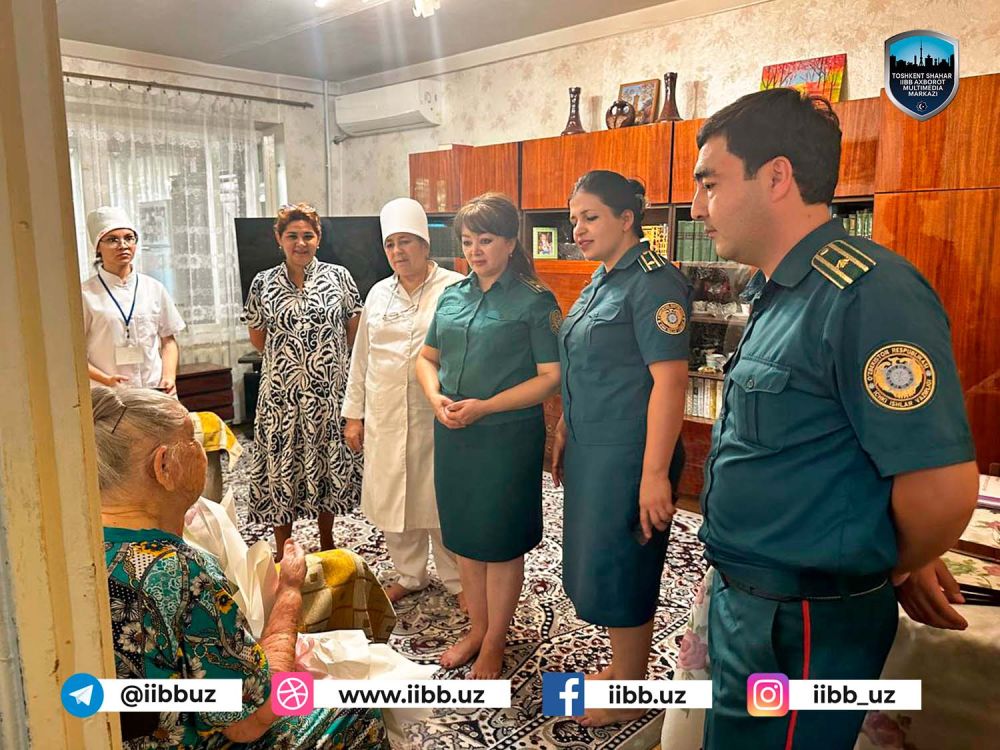 Навещать пожилых и престарелых, больных и одиноких людей является человеческим долгом каждого из нас. В преддверии Дня независимости ответственные сотрудники УКД ОВД Юнусабадского района совместно с активистами махалли и медицинскими работниками проведали участницу Второй мировой войны Веру Васильевну Мурину, проживающую в махалле Буюк Турон. Пожилой женщине оказана медицинская помощь и передан набор продовольственных продуктов.