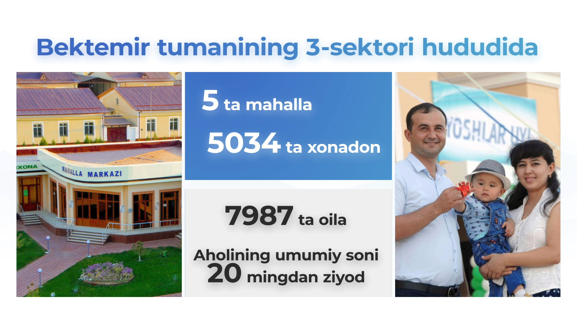 На территории 3-го сектора Бектемирского района столицы находится пять махаллей, где в 5 034 домах проживает 7 987 семей. Общая численность населения – более 20 тысяч человек.