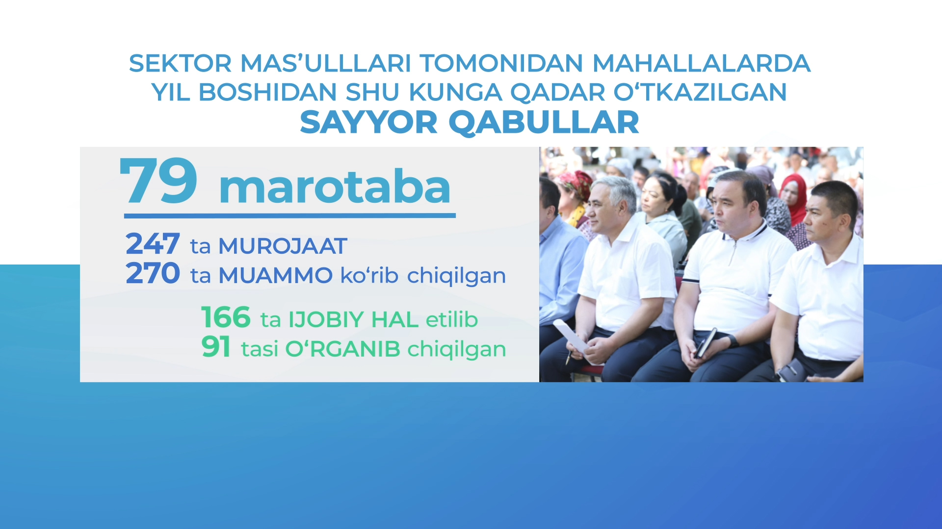 В целях обеспечения интересов человека первоочередное внимание уделяется работе с населением, оказанию необходимой помощи людям. Ответственные лица 3-го сектора с начала года провели 79 выездных приемов, изучили 247 обращений, 166 из которых были решены положительно, 91 – находится на стадии рассмотрения.