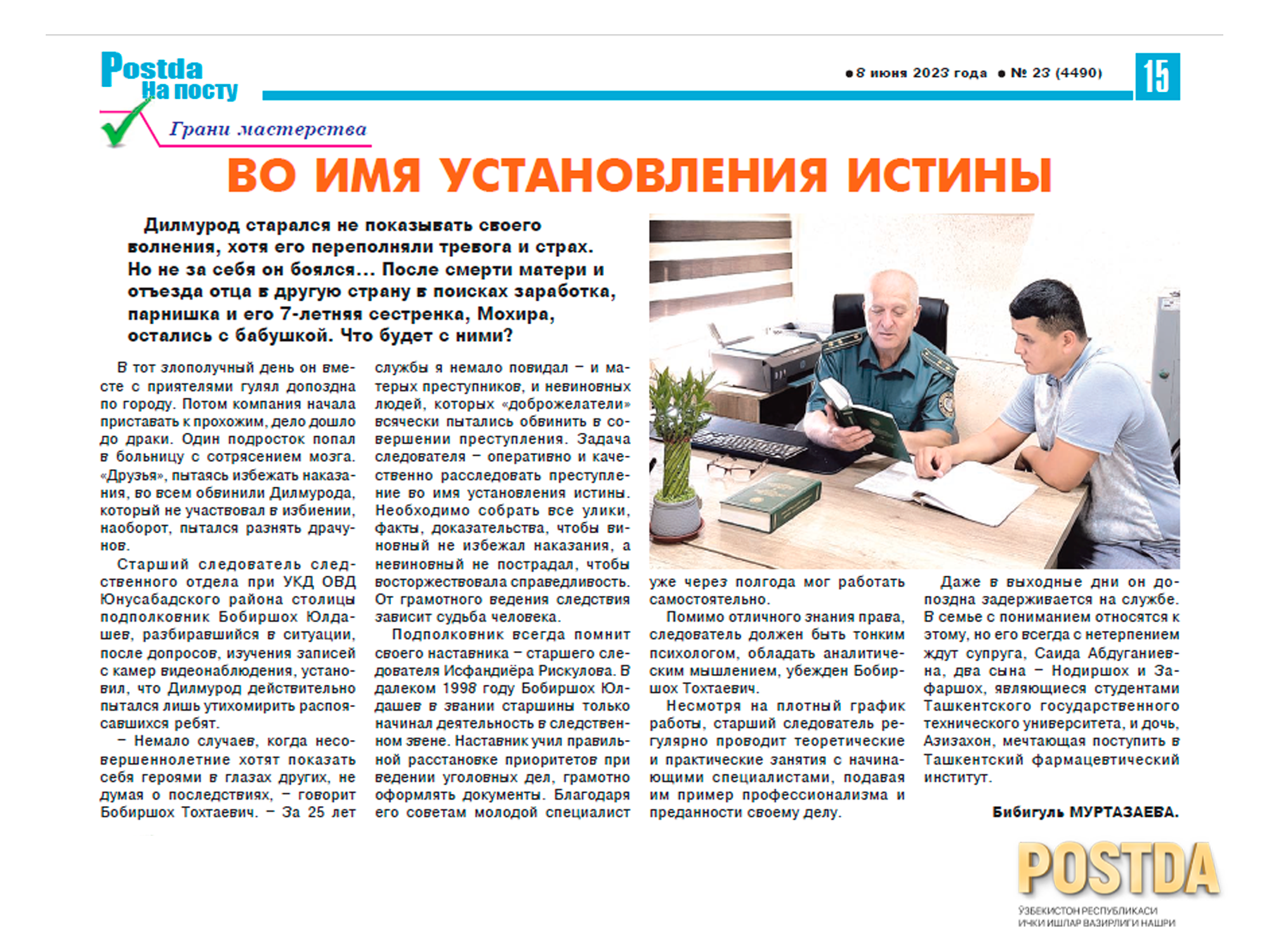 Бобиршох Юлдашев - старший следователь следственного отдела УКД ОВД Юнусабадского района столицы подполковник с первой встречи сразу понял, что Дилмурод ни при чем и собрал все доказательства его невиновности. Отзывы одноклассников и классного руководителя, свидетелей происшествия, а также нашел материалы с камер видеонаблюдения, где можно было увидеть, что он только разнимал и не участвовал в избиении.