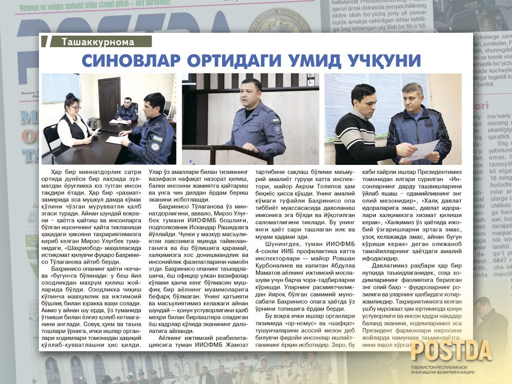 Юртбошимизнинг республикамиз маҳаллаларида хавфсиз муҳитни яратиш,  ҳуқуқбузарликларни барвақт аниқлаш орқали уларга барҳам бериш борасида имзолаган қарорининг ижроси пойтахт ички ишлар ходимларининг, айниқса маҳаллаларда фаолият юритувчи профилактика инспекторларининг кундалик долзарб вазифасига айланиб, барча куч-воситалар ҳудудларда криминоген вазиятни барқарорлаштириш, иш самарадорлигини оширишга қаратилган. Профилактика инспекторларининг  маҳалла аҳли, “еттилиги”, корхона-ташкилотлар масъуллари билан бир ёқадан бош чиқариб жиноятчилик ҳамда ҳуқуқбузарликларга қарши кураши натижасида кўплаб маҳаллаларда тинчлик ва осойишталик ҳукм сурмоқда. Пойтахтимизнинг Чилонзор туманида жойлашган “Хирмонтепа” маҳалласида етти мингга яқин турли миллат вакиллари истиқомат қилиб келишади. Маҳалла “сариқ” тоифада. Маҳаллада тинчлик-осойишталикни таъминлаш, жиноятчилик, ҳуқуқбузарликларнинг барвақт олдини олиш орқали маҳаллани намунали “яшил” тоифага ўзгартириш   мазкур ҳудудда хизмат олиб бораётган ички ишлар ходимлари, профилактика инспекторларининг мақсади. Жорий йилнинг 13 март куни маҳалла ҳудудини айланиб юрган капитан Лазиз Абдикаримов  42-уйнинг олдидан ўтаётиб, икки йигитнинг хатти-ҳаракатига эътиборини қаратди. Улар формали ходимни кўрибоқ, кўзларини олиб қочиб, кетишга тараддудланишди. Лазиз уларнинг олдига бориб, шахси, кимни кутаётгани ҳақида сўраб-суриштираётганида улар гапни чалғитиб, тезроқ кетишга уринишди. Лазиз уларнинг қўлидаги қора сумкасини очишни сўраганида улар сумкани ташлаб қоча бошлашди. Жисмоний машғулотларда чиниққан Лазиз уларни қувиб кетаркан, маҳалла аҳли ёрдамга ошиқишди. 2004 йилда туғилган ҳар икки заҳри-қотил тарқатувчи йигитлар қўлга олиниб, холислар иштирокида сумка текширилганда, унинг ичида капсула шаклидаги 285 дона кучли таъсир қилувчи психотроп моддалар аниқланиб олинди. Йигитларнинг телефони текширилганида, улар  2 жойга 5тадан 10та худди шундай капсулаларни махфий яшириб қўйганлиги аниқланди. Капитан Лазиз Абдикаримов ички ишлар органларидаги фаолиятини 2019 йилда Республика ИИВ Академиясини битириб, Миробод тумани “Янги Миробод” маҳалласи профилактика инспектори лавозимидан бошлаган. Сўнг Чилонзор туманида жойлашган оғир  – “қизил” тоифада бўлган “Бешқўрғон” маҳалласида хизматни давом эттирди. 2025 йилдан мазкур “Хирмонтепа” маҳалласида профилактика инспектори бўлиб хизмат қилиб келмоқда. Унинг ҳушёрлиги ва тезкор ҳаракатлари туфайли неча ўнлаб хонадонларга кулфат келтирувчи, оилалар парокандалигига сабаб бўлувчи жиноятлар келиб чиқишининг олди олинишига эришилди. Унинг касбига фидойилиги,  бурчига садоқати, матонати раҳбарият томонидан эътиборсиз қолдирилмади. Куни кеча Тошкент шаҳар ИИББ мажлислар залида ўтказилган йиғилишда пойтахтнинг Чилонзор тумани ИИО ФМБ  ҲПБ профилактика инспектори, капитан Лазиз Абдикаримовга навбатдан ташқари “майор” унвони берилди. Мазкур унвон лавҳамиз қаҳрамонини  ўз бурчига масъулиятини янада кучайтириб, зиммасидаги вазифаларни сидқидилдан  бажаришида руҳлантириб, янги муваффақиятлар сари етаклаши, табиий.
