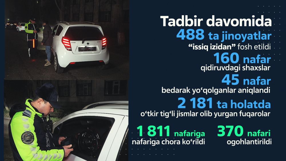 Тошкент шаҳрида тинчлик ва осойишталикни сақлаш, жамоат тартибини таъминлаш, жиноят ва ҳуқуқбузарликларни барвақт олдини олиш мақсадида барча ҳуқуқни муҳофаза қилувчи орган ходимлари туну кун хизмат олиб бормоқда. Муқаддам хабар берганимиздек, пойтахтда жиноятларга қарши кескин курашиш ва ҳуқуқбузарликларни барвақт олдини олиш мақсадида Тошкент шаҳар ИИББ, ДХХ Тошкент шаҳар бошқармаси, шаҳар прокуратураси, Миллий Гвардия Тошкент шаҳар бошқармаси билан ҳамкорликда 15 январь кунидан 15 февраль кунига қадар “Хавфсиз ва соғлом пойтахт” комплекс махсус тезкор-профилактик тадбирлар ойлиги ўтказилди. Ойлик давомида, ташкил этилган махсус гуруҳлар томонидан жами 801 та гиёҳвандлик воситалари, психотроп моддалар ва кучли таъсир қилувчи воситаларнинг ноқонуний муомаласи билан боғлиқ ҳолатлар аниқланди. Улар бўйича 567 та жиноят иши қўзғатилди, 158 та маъмурий баённомалар расмийлаштирилди, 76 та ҳолат бўйича терговга қадар текширув ҳаракатлари олиб борилмоқда. Кўрилган тезкор чора-тадбирлар натижасида жами 21 кг 818 гр гиёҳвандлик воситалари, 28 790 та кучли таъсир қилувчи, 26 кг «прегабалин» дори воситалари ноқонуний муомаласига чек қўйилди ва минглаб инсонларнинг заҳарланиши олди олиниб, ҳаёти сақланиб қолинди. Гиёҳвандлик воситаларини яшириш усули орқали тарқатувчилар билан боғлиқ 34 та ҳолат аниқланиб, унинг натижасида 9 кг 538 гр ноқонуний гиёҳвандлик моддалари ҳамда 3 689 дона кучли таъсир қилувчи дори воситаларининг ноқонуний муомаласи тўхтатиб қолинди. Гиёҳвандлик воситалари ва психотроп моддаларнинг савдоси билан шуғулланувчи интернет дўконлари, уларнинг администратор ва операторларини аниқлаш, фаолиятига чек қўйиш борасида тезкор-қидирув тадбирлари ўтказилди. Бундай интернет дўконларнинг рекламаси акс этган жами 1 323 та «наркограффити»лар аниқланиб, бартараф қилинди. Гиёҳванд моддалар ҳамда кучли таъсир қилувчи дори воситаларига ружу қўйган 501 нафар шахслар махсус тиббиёт муассасаларига даволанишга ётқизилди. Бундан ташқари, аҳоли, айниқса ёшлар орасида гиёҳванд моддалари ва кучли таъсир қилувчи дори воситаларига нисбатан муросасиз муносабатни шакллантириш мақсадида, таълим муассасалари ва жамоат жойларида аҳоли билан 50 мингдан зиёд профилактик тадбирлар, учрашувлар ва давра суҳбатлари ўтказилди. Миллий гвардия Тошкент шаҳар бошқармаси билан ҳамкирликда умумталим мактабларда 3 536 маротаба профилактик тарғибот ишлари олиб борилди. Мазкур тадбирлар доирасида жами 2 миллиондан ортиқ фуқаролар қамраб олинди. Ўтказилган тезкор-қидирув тадбирлари натижасида жами 488 та жиноятлар “иссиқ изидан” фош этилди, 160 нафар қидирувдаги шахслар ушланди, 45 нафар бедарак йўқолганлар аниқланиб яқинларига қайтарилди. Ўткир тиғли буюмларни қонунга хилоф равишда олиб юрган 2 181 нафар фуқаролар аниқланиб тегишли тартибда маъмурий баённомалар расмийлаштирилди. Тезкор тадбирлар давомида 1 та жанговар (ПМ), 21 та пневматик қурол ва 7 та ўқ-отар ов милтиғи ҳамда 14 дона ўқ-дорилар ноқонуний муомаладан олинди. Ҳар бир ҳолат юзасидан жиноят ишлари қўзғатилиб, тергов ҳаракатлари олиб борилмоқда. Йўл ҳаракати қоидалари билан боғлиқ 102 404 та қоидабузарлик аниқланган. Шундан, қўпол қоидабузарликлар 9 807 та, маст ҳолда автомашина бошқариш 366 та, светофор ишораларига амал қилмаслик 83 тани ташкил қилмоқда. Олиб борган тадбирлар натижасида олд