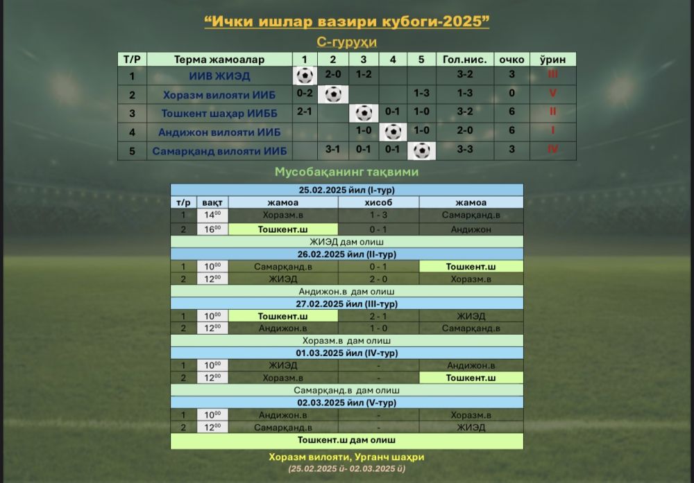 Ҳозирги кунга қадар терма жамоамиз Андижон, Самарқанд ва Жазони ижро этиш департаменти жамоаларига қарши кураш олиб борди ҳамда битта мағлубият ва иккита ғалаба билан 6 очко тўплаб гуруҳ баҳсларида Андижон вилояти ИИБ терма жамоаси билан пешқадамлар сафида бормоқда.