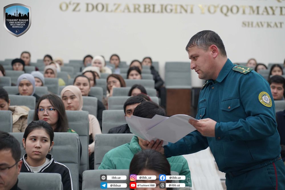 Учрашувда сўзга чиққан туман ИИО ФМБ бошлиғи полковник Дилмурод Мирсадиков ўз нутқида жамиятнинг глобал муаммоларидан бири гиёҳвандлик эканлиги, бутун дунёда бўлгани каби пойтахтда ҳам ҳуқуқ-тартибот идоралари ходимлари гиёҳвандлик, психотроп моддалар ва кучли таъсир қилувчи моддаларнинг ноқонуний айланишига қарши тинимсиз кураш олиб бораётганлигини таъкидлади. бу иллатга қарши курашишнинг энг самарали усулларидан бири - гиёҳвандликка қарши иммунитетни шакллантиришдир. Бу йўналишда айниқса ёшлар ўртасида профилактика тушунтириш ишларини кучайтириш лозимлиги эътироф этилди. Шунингдек, учрашувда интернет маконларида гиёҳвандлик воситаларнинг ноқонуний савдоси билан шуғулланувчи гуруҳ ва каналларга аъзо бўлмаслик, улар ҳақида бирор маълумот бўлса ИИОга хабар берш кераклиги таъкидланди. Қизғин ўтган тадбирда талабалар ўзларини қизиқтирган саволларига тўлиқ жавоблар олишди.