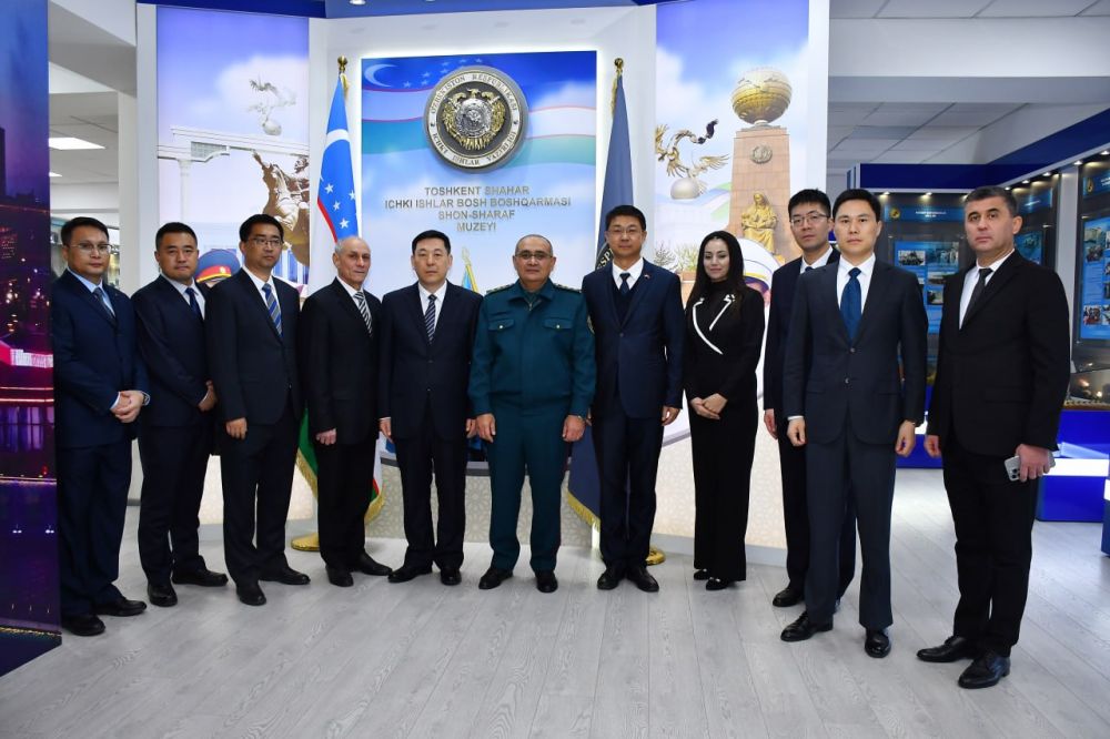 Хитой халқ республикаси Пекин полиция Академияси бошлиғи Ву Вей бошчилигидаги делегация Тошкент шаҳар ИИББга ташриф буюрди. Пойтахт ИИББ бошлиғи, генерал-майор Азиз Ташпулатов билан ўтказилган учрашувда жамоат хавфсизлигини таъминлаш ва жиноятчиликка қарши кураш соҳасида тажриба алмашиш, ҳуқуқ-тартибот органлари фаолиятига рақамли технологияларни кенг жорий этиш, ҳамкорликда малака ошириш курсларини ташкиллаштириш юзасидан фикр алмашилди. Шунингдек, меҳмонлар Бош бошқарма Ягона тезкор бошқарув марказида бўлишиб, бу ерда жиноятчилик ва ҳуқуқбузарликларни олдини олиш борасида яратилган шарт-шароитлар, замонавий технологиялар, ходимларнинг иш услублари билан яқиндан танишиб, амалга оширилаётган ишларни юқори баҳоладилар. Делегация аъзолари Ахборот мультимедиа марказида ҳам бўлиб, пойтахт ИИББ фаолиятининг ёритилиши, аҳоли билан тўғридан-тўғри мулоқотнинг йўлга қўйилгани, ахборот ва хабарларнинг ўз вақтида жамоатчиликка етказилиши борасида амалга оширилаётган ишлар уларда катта таассурот қолдирди. Айниқса, ходимларнинг фаолиятига бағишлаб ишланган видео роликни томоша қилган меҳмонлар, таржимасиз ҳам уни тушуниб олганларини мамнуният билан қайд этишди. Пойтахт Бош бошқармасида ташкил этилган Ички ишлар тизимининг илк фаолиятидан бошлаб шу кунигача ҳикоя қилувчи “Шон-шараф” музейи, музей экспонатлари ҳамда хизмат вазифасини бажариш чоғида мардона ҳалок бўлган ходимларга кўрсатилган чуқур эҳтиром уларнинг эътирофига сазовор бўлди. Нуфузли меҳмонларнинг юртимизга ташрифи давомида ички ишлар вазирлиги тизимидаги бошқа йўналишлар билан ҳам яқиндан танишишди. Келгусида Пекин полицияси Академияси билан ҳамкорликни йўлга қўйиш юзасидан келишиб олинди.
