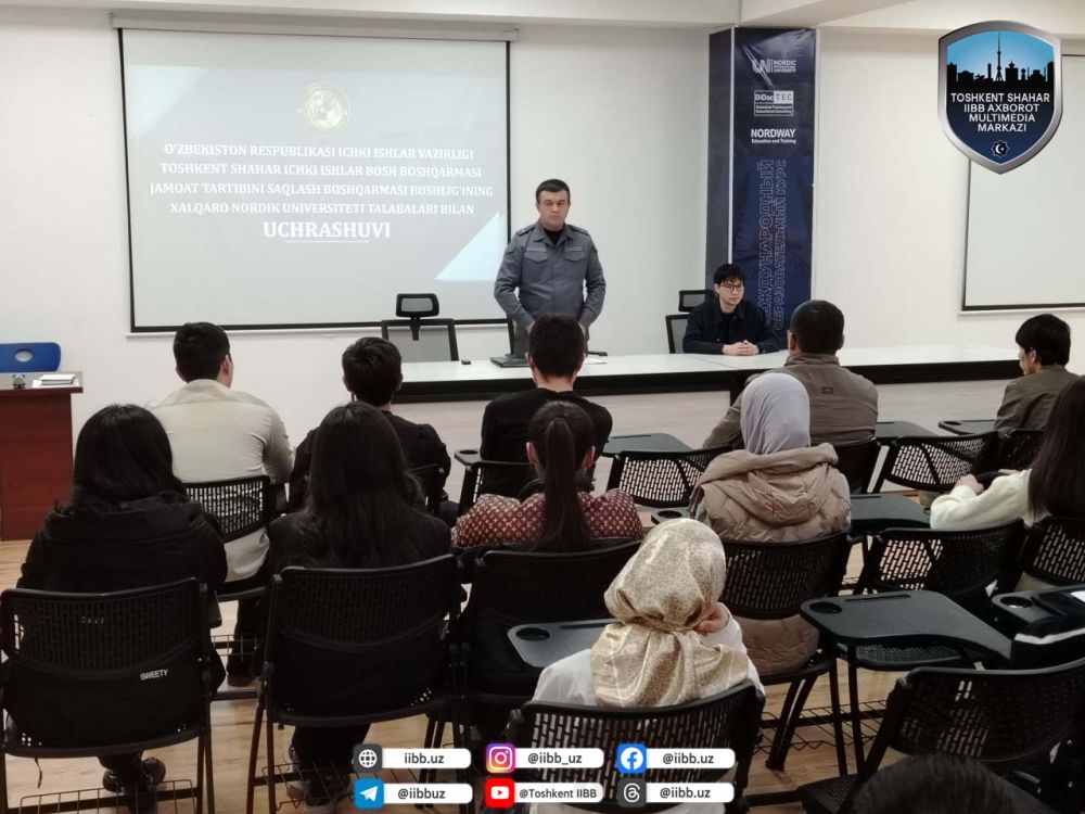 Маълумки, жорий йилнинг январ ойида Ўзбекистон Республикаси Президенти томонидан 2025 йилда Республикамиз маҳаллаларида хавфсиз муҳитни яратиш ва ҳуқуқбузарликларнинг олдини олишга қаратилган қарори қабул қилинганди. Мазкур қарор бандларидан келиб чиққан ҳолда, Ўзбекистон Республикаси Ички ишлар вазирлиги ҳамда Республика Олий таълим ва инновациялар вазирлигининг 2025 йил 8 март куни қўшма қарори ишлаб чиқилган. Унга мувофиқ олий таълим муассасалари талабаларини ҳар томонлама қўллаб-қувватлаш, талаба ёшларни маънавий-ахлоқий фазилатларига салбий таъсир кўрсатиши мумкин бўлган оммавий маданият, ёт ва бузғунчи ғоялар таъсиридан асраш, улар ўртасида салбий ҳолатлар ҳамда ҳуқуқбузарликлар содир этилишининг олдини олиш, ҳуқуқбузарликлар содир этишга мойил шахсларни барвақт аниқлаш каби чора-тадбирларни амалга ошириш белгиланган. Куни кеча шаҳримизда жойлашган INXA университетида бўлиб ўтган учрашув ана шу мавзуга бағишланди. Учрашувда университет масъуллари, Тошкент шаҳар ИИББ Миграция ва фуқароликни расмийлаштириш бошқармаси бошлиғи, полковник Улуғбек Мирзакамбаров, Университет профилактика инспектори ва талабалар иштирок этишди. Учрашувда шунингдек талабалар миграция, ID карталари, вақтинчалик ва доимий рўйхатдан ўтиш, республикамизга кириб-чиқиш тартиби бўйича кўплаб саволларига жавоблар олишди. Худди шу каби очиқ ва эркин мулоқот тарзида ташкиллаштирилган учрашув Халқаро Нордик университетида ҳам бўлиб ўтди. Тадбирда университет маъмурияти, Тошкент шаҳар ИИББ ЖТСБ бошлиғи, подполковник Баходир Анваров ҳамда профилактика инспекторлари, талабалар иштирок этишди. Учрашувда талаба ёшларни, бугунги кунда қийнаётган ижтимоий маиший ва бошқа муаммолари шунингдек, пойтахт ҳудудида содир этилаётган ҳуқуқбузарликлар ва жиноятлар айниқса, ёшлар орасида кенг тарқалаётган гиёҳвандлик ва психотроп воситалари билан боғлиқ ҳолатлар ва ушбу иллатларга қарши курашиш чора-тадбирлари кенг муҳокама этилди. Муҳокама сўнгида талабаларнинг бу каби салбий ҳолатларга муносабати, жиноятчилик ва ҳуқуқбузарликларга қарши курашнинг самарадорлигини ошириш борасидаги таклиф ва мулоҳазалари ҳам ўрганилди. Савол-жавоблар тарзида ўтган очиқ ва эркин мулоқот ҳар икки томон учун қизиқарли ва фойдали бўлгани таъкидланди.