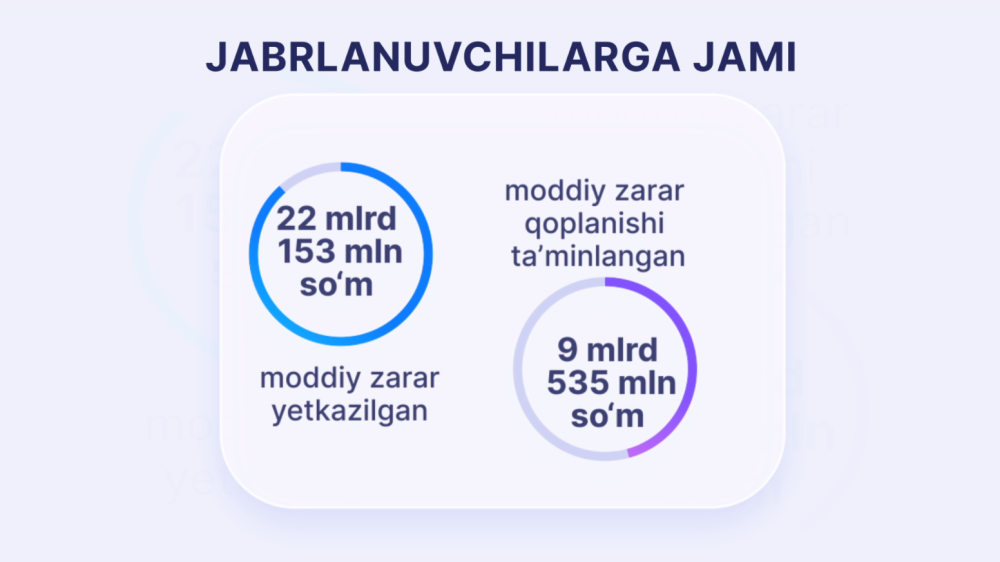 Натижада жиноят учун жавобгарлик муқаррарлиги ва қонун устуворлиги принциплари таъминланган. Жабрланувчиларга етказилган моддий зарар қопланишига эришилган. Жумладан ушбу қидирувдаги шахслар томонидан жабрланувчиларга жами 22 млрд 153 млн сўм миқдорида моддий зарар етказилган бўлиб, шундан 9 млрд 535 млн сўм миқдоридаги моддий зарар қопланиши таъминланган.