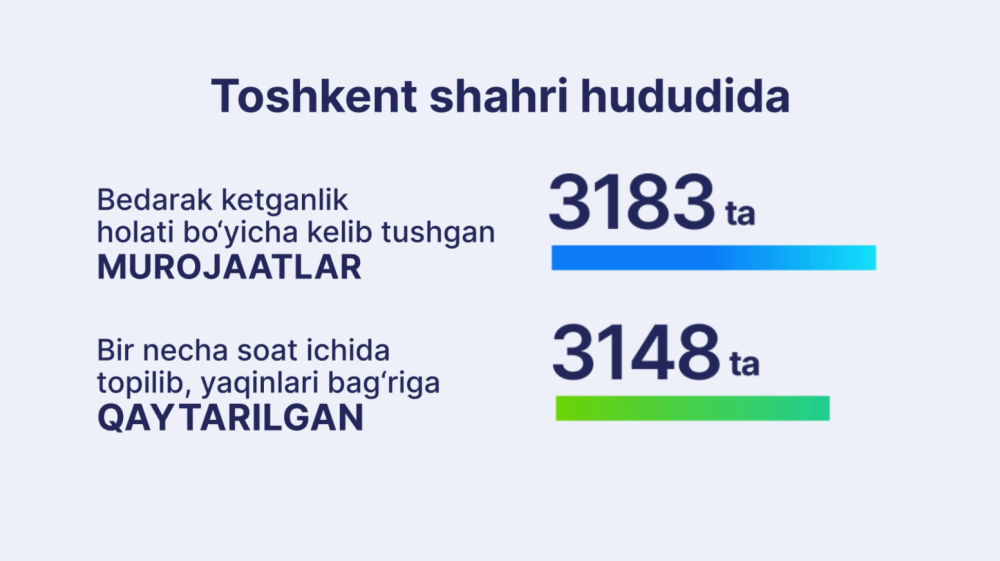 Йил бошидан Тошкент шаҳри ҳудудида бедарак кетганлик ҳолати бўйича 3 183 та мурожаат келиб тушган. Ушбу фуқароларнинг 3 148 нафари бир неча соат ичида топилиб, яқинлари бағрига қайтарилган.