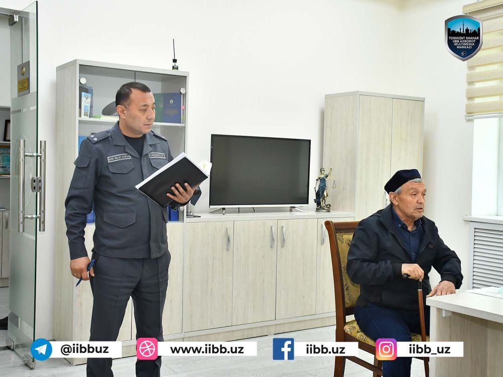 Аҳоли мурожаатларини бевосита ўрганиш ва ўз вақтида кўриб чиқилишини таъминлаш мақсадида ички ишлар органларида мунтазам равишда фуқаролар қабули ўтказиб келинмоқда. Бугун пойтахт ИИББ бошлиғи томонидан ўтказилган шахсий қабулда ҳам 30 га яқин фуқаролар ўз мурожаатларини баён қилишди. Кўриб чиқилган мурожаатларнинг 12 таси маъмурий ҳуқуқбузарлик ва терговга оид ишлар юзасидан, 5 таси ишга кириш ва ижтимоий ҳимоя бўйича, 2 таси Ўзбекистон Республикаси фуқаролигини олиш, 7 таси пробация рўхатидан чиқариш, 2 таси бошқа масалалар юзасидан бўлди. Мурожаатларнинг 9 таси жойида ижобий ҳал этилди, 3 таси бўйича малакали юридик тушунтиришлар берилди, 19 та мурожаатлар қўшимча текширувни талаб қилганлиги боис тегишли мутасаддиларга топшириқ ва кўрсатмалар берилиб, ҳал этиш юзасидан муддатлар белгиланди. Мисол учун, пробация ҳисобида турган фуқаролар С.И., Н.М., У.С., У.Қ.лар муддатидан илгари шартли равишда озод қилинди. Фуқаролар О.О., Б.Т. ва Д.Д.ларга маҳалла еттилиги билан ҳамкорликда моддий ёрдам берилиб ишга жойлаштирилди.
