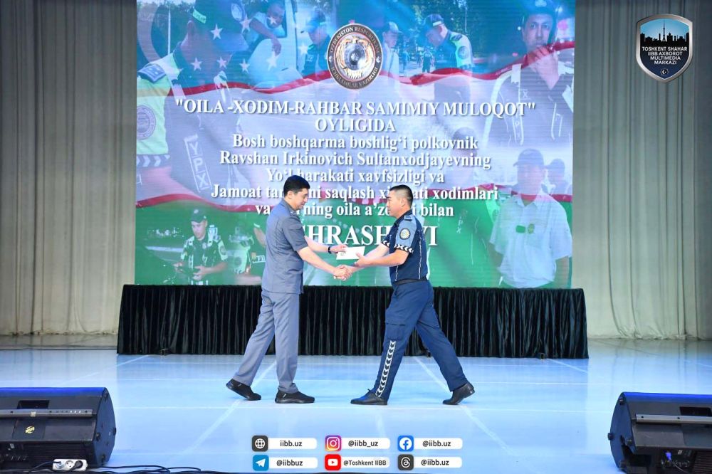 “Оила-ходим-раҳбар самимий мулоқоти” ойлиги доирасида куни кеча пойтахтимизнинг муҳташам “Туркистон” саройида ИИББ Йўл ҳаракати хавфсизлиги ва Патруль-пост хизмати бошқармалари ходимлари билан йиғилиш ўтказилди. Хизмат интизоми ва қонунчиликни мустаҳкамлаш, ўз вазифаларини сидқидилдан бажариб, пойтахтимиз ҳудудида тинчлик-осойишталикни таъминлаш, жамоат тартибини сақлаш, жиноятчилик, ҳуқуқбузарликларга қарши курашиш борасида фидойи хизмат қилиб келаётган ходимларни рағбатлантириш орқали уларда хизматга бўлган иштиёқи ва ижобий муносабатларини шакллантиришга қаратилган учрашувда ЙҲХБ, ППХБ ходимлари, уларнинг ота-оналари ва фахрийлар иштирок этишди.