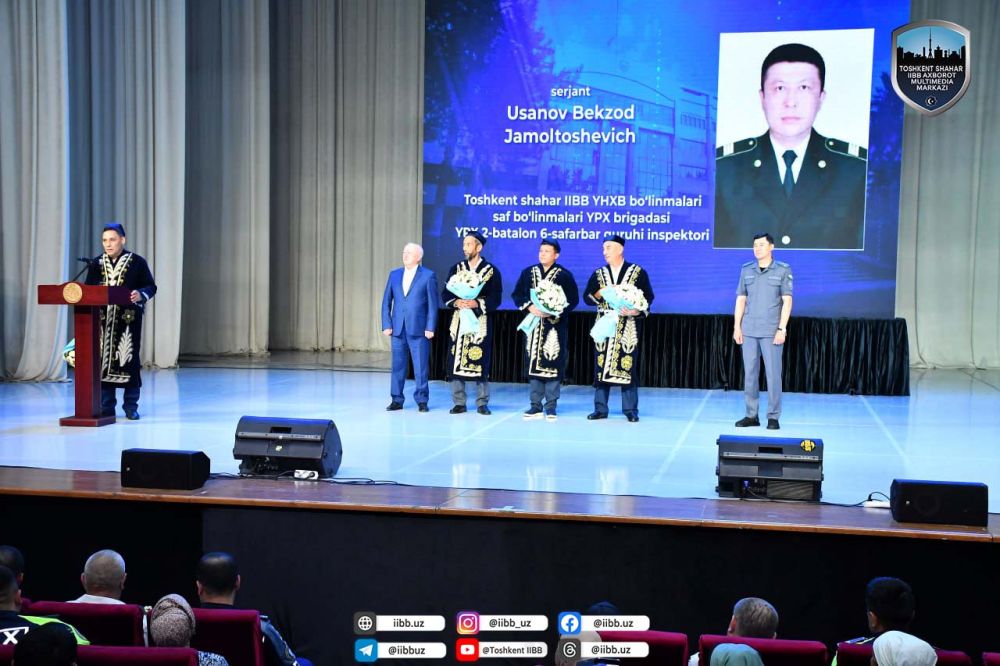 Шундан сўнг ўз хизмат бурчларини виждонан бажариб келаётган, пойтахтимиз ҳудудида жамоат тартибини сақлаш, фуқароларимиз хавфсизлигини, ҳуқуқ ва эркинликларини таъминлаш, жиноятчиликка қарши курашиш борасида самарали хизмат қилаётган бир гуруҳ ходимларимизни тақдирлаш учун сўз ИИББ бошлиғи ўринбосари, полковник Алиаҳмед Чориевга берилди. А.Чориев пойтахт Ички ишлар бош бошқармаси томонидан ҳудудда тинчлик-осойишталикни таъминлаш борасида соҳавий хизматлар томонидан амалга оширилаётган ишларга эътиборни қаратди. Тошкент шаҳар аҳолисига қулайликлар яратиш, кўчаларда ҳаракат хавфсизлигини таъминлаш, йўл-транспорт ҳодисалари, жиноятчиликни олдини олиш, жамоат тартибини сақлаш, хавфсизлигини таъминлаш, гиёҳвандлик ва психотроп моддаларни аниқлаш, гиёҳвандлик билан боғлиқ жиноятларни фош этиш, қидирувдаги шахсларни ушлаш, оммавий тадбирларда барқарорликни таъминлаш ишларида фаол қатнашиб, ўз вазифаларига виждонан, сидқидилдан ёндашиб, ҳамкасбларига ўрнак бўлиб келаётган бир гуруҳ ходимларга мукофотлар топширилди. Уларнинг ота-оналарига миннатдорлик эълон қилинди. Ички ишлар органларида самарали меҳнат қилиб, хизмат муддатларини ўтаб, нафақа ёшига етган ходимлар тантанали равишда нафақага кузатилди. Йиғилишнинг бадиий қисми ИИББ қошидаги “Ниҳол” ҳаваскорлик гуруҳининг бадиий чиқишлари, шўх куй-қўшиқлари, рақслари билан давом эттирилди.