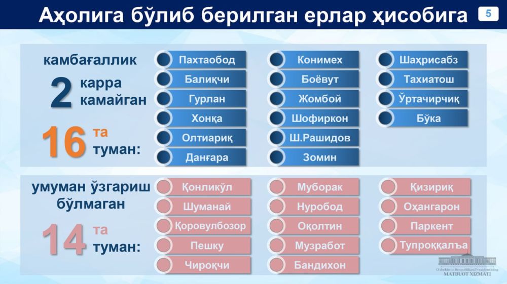 Аҳолига бўлиб берилган ерлар бўйича 16 та туманда 2-3 мартадан ҳосил олиш ҳисобига камбағаллик 2 карра камайди. Булар – Пахтаобод, Балиқчи, Гурлан, Хонқа, Олтиариқ, Данғара, Конимех, Боёвут, Жомбой, Шофиркон, Ш.Рашидов, Зомин, Шаҳрисабз, Ўртачирчиқ, Бўка, Тахиатош туманлари.